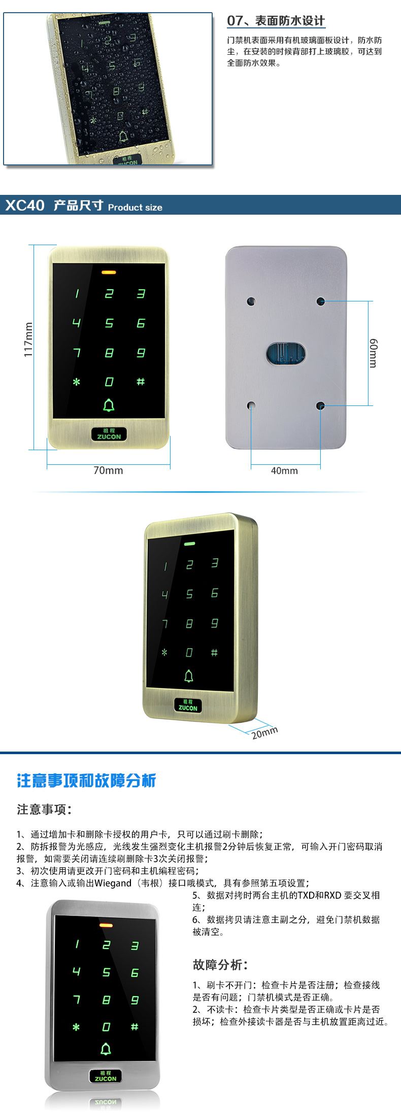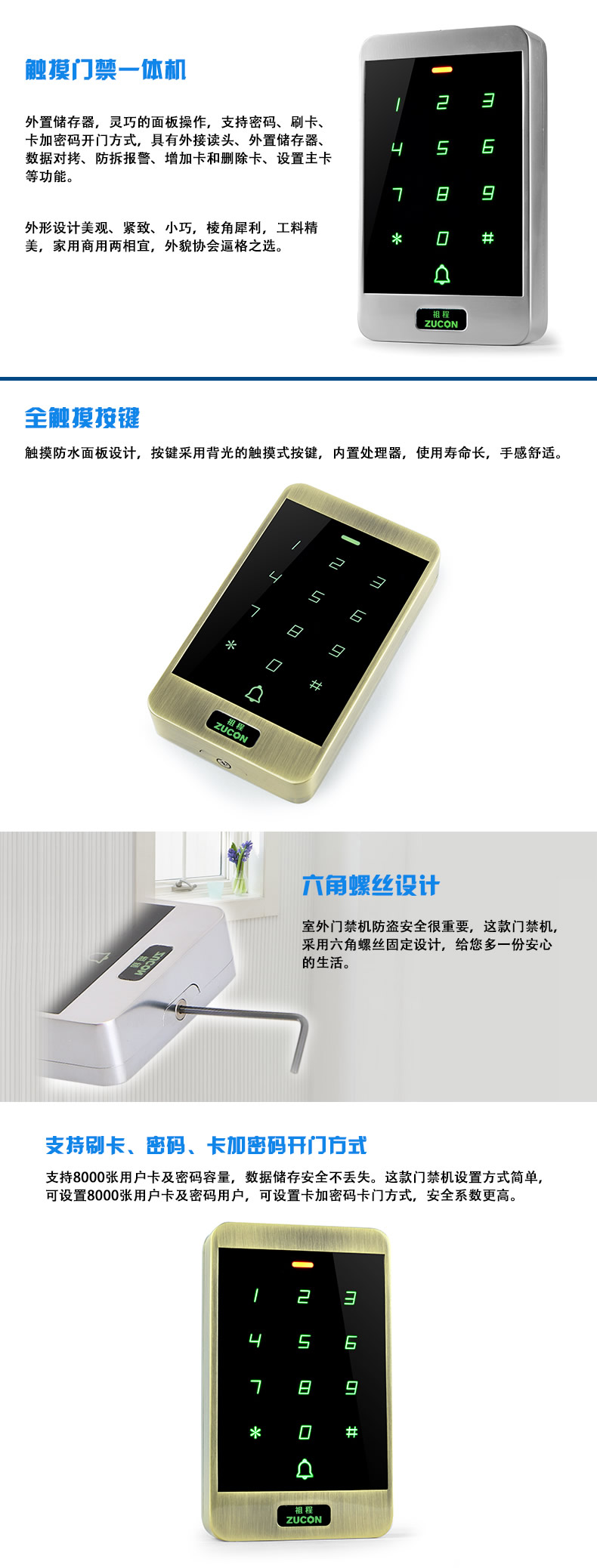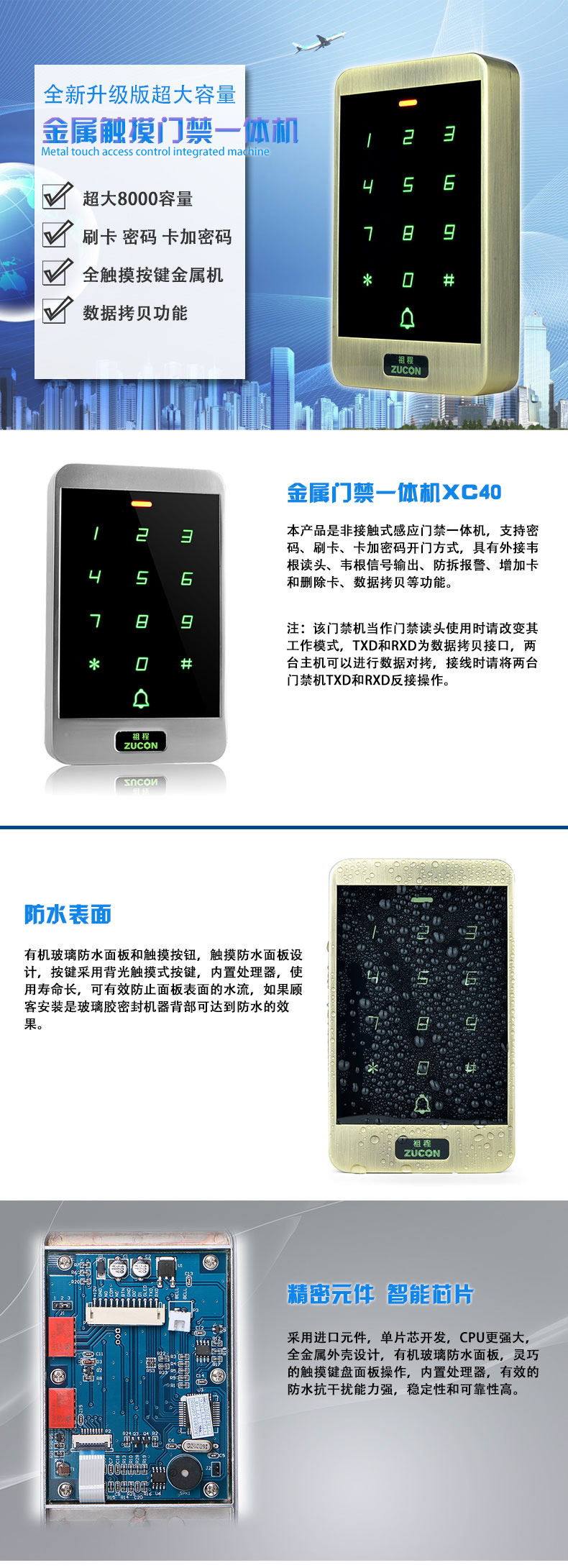 ZUCON XC40升级全触摸金属门禁一体机防砸室外防水防雨刷卡器