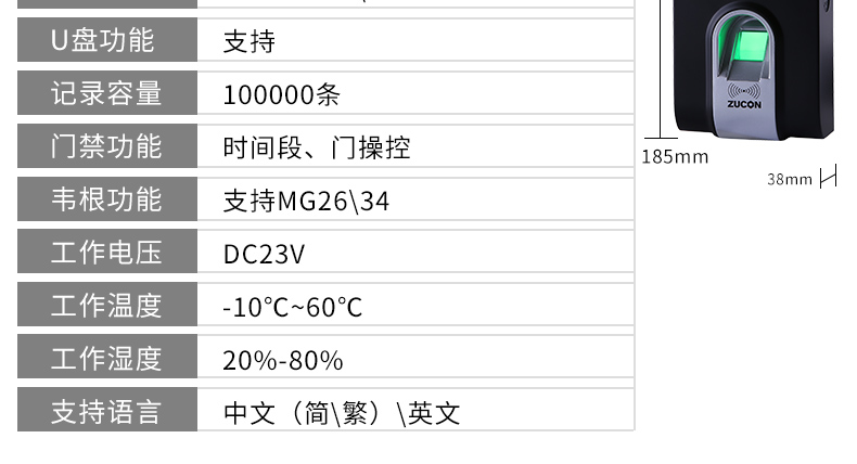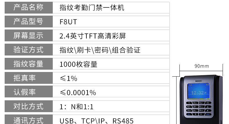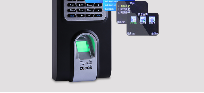 ZUCON F8UT指纹刷卡门禁考勤机 网络U盘下载数据 2.4寸高亮度语音彩屏显示
