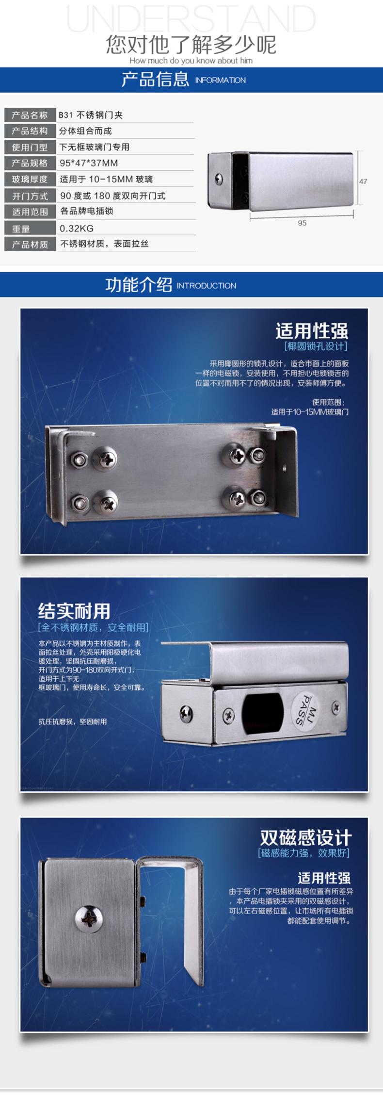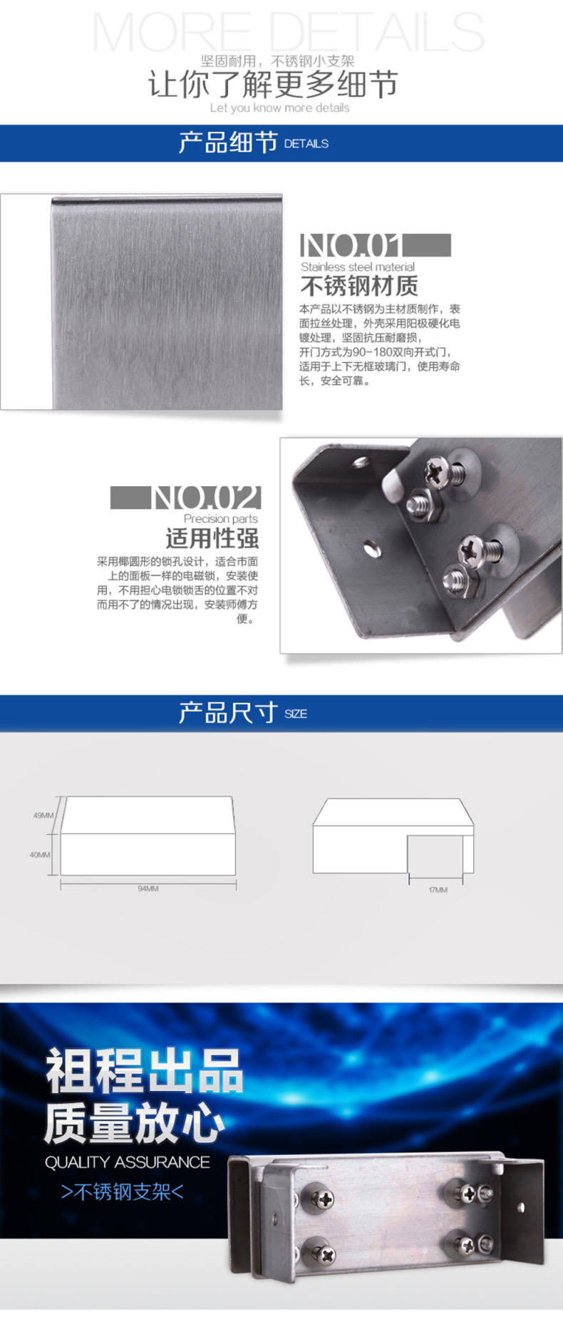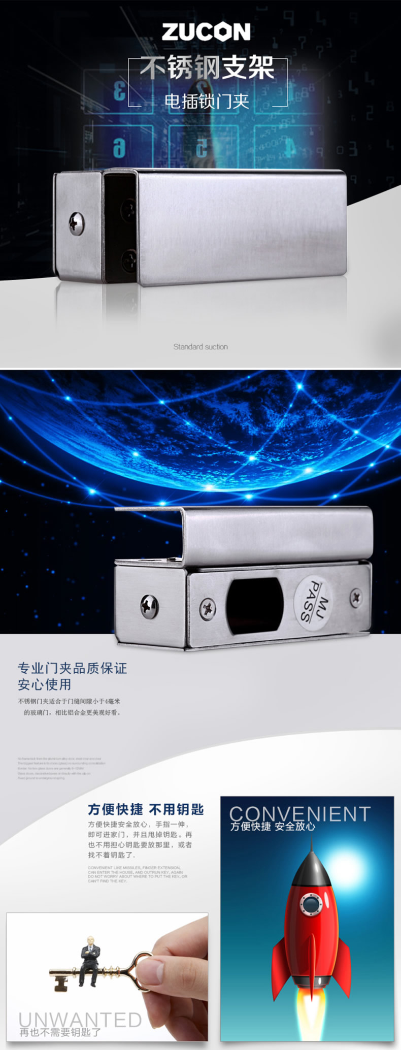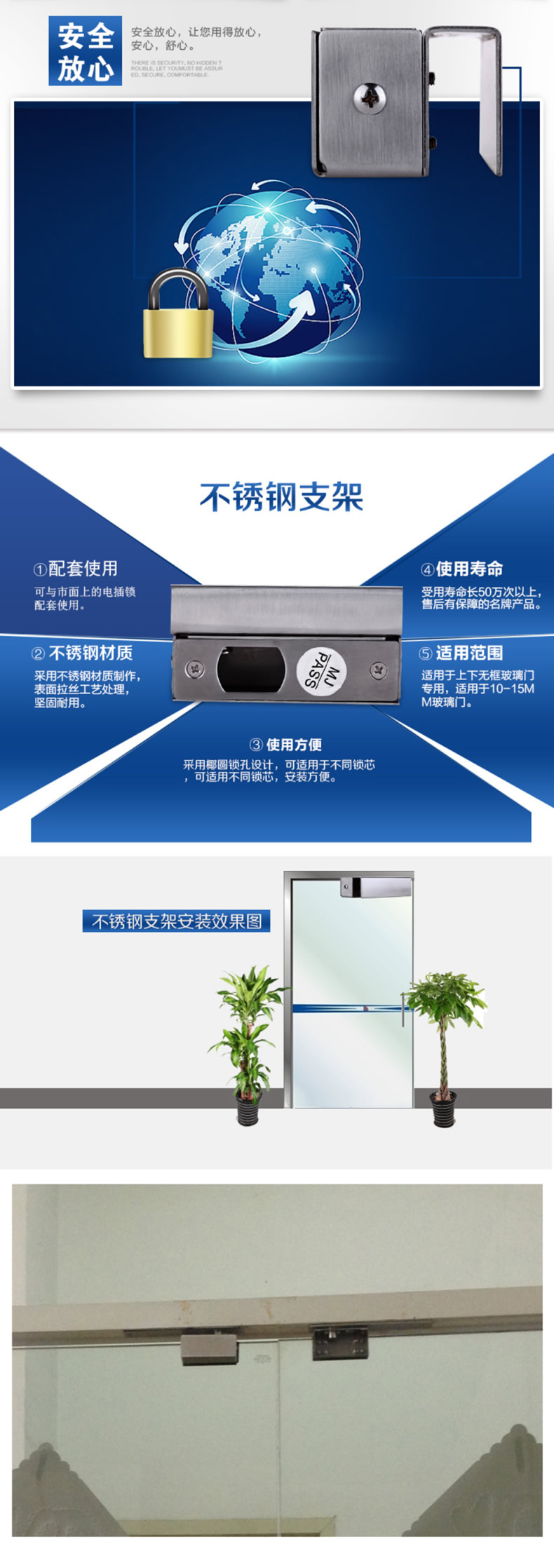 ZUCON B31电插锁不锈钢支架 电插锁小门夹 玻璃门不锈钢门夹
