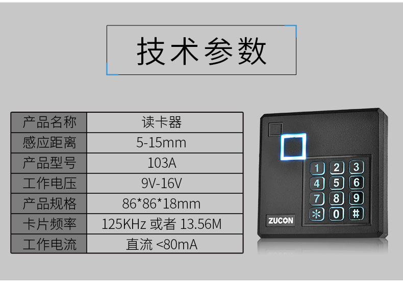 ZUCON 103A密码门禁读卡器 ID卡IC卡按键门禁读头 读卡器门禁刷卡器配控制板