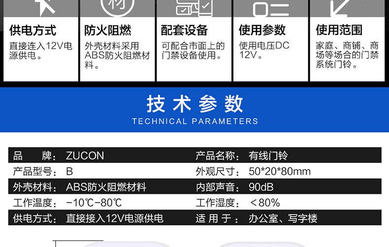 ZUCON B11电子门铃 门禁系统配套门铃 12V电子门铃 无需电池门铃