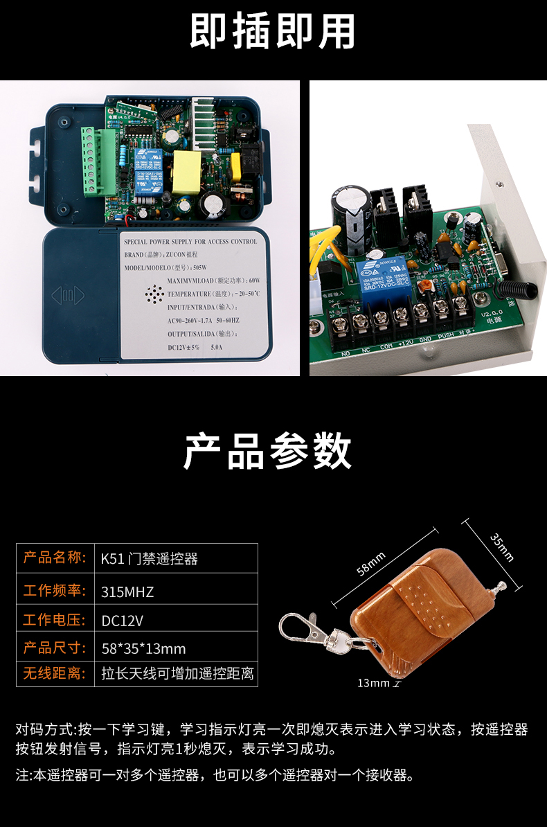 ZUCON k51直插式无线遥控器无线遥控开关 电子门禁系统配套遥控
