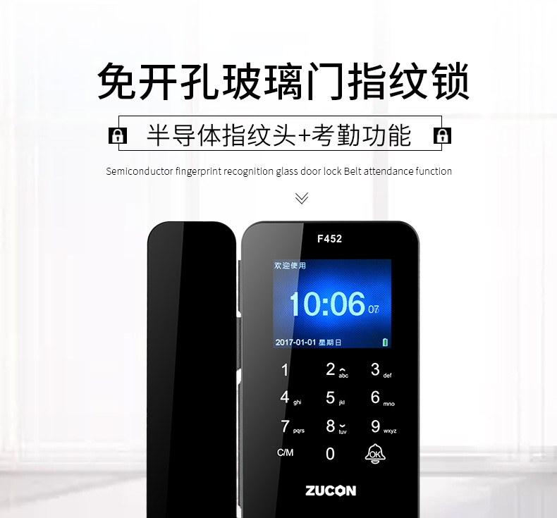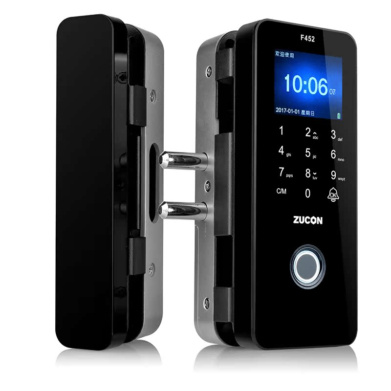 ZUCON F452玻璃门指纹锁带钩锁免开孔办公电子密码锁单开对开免插销