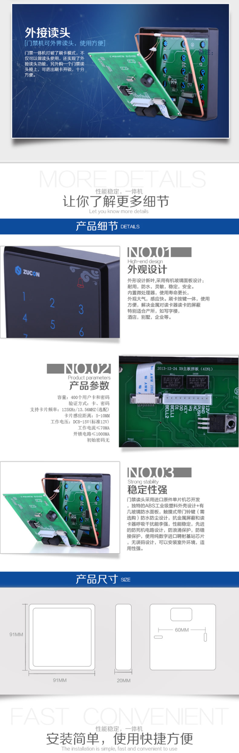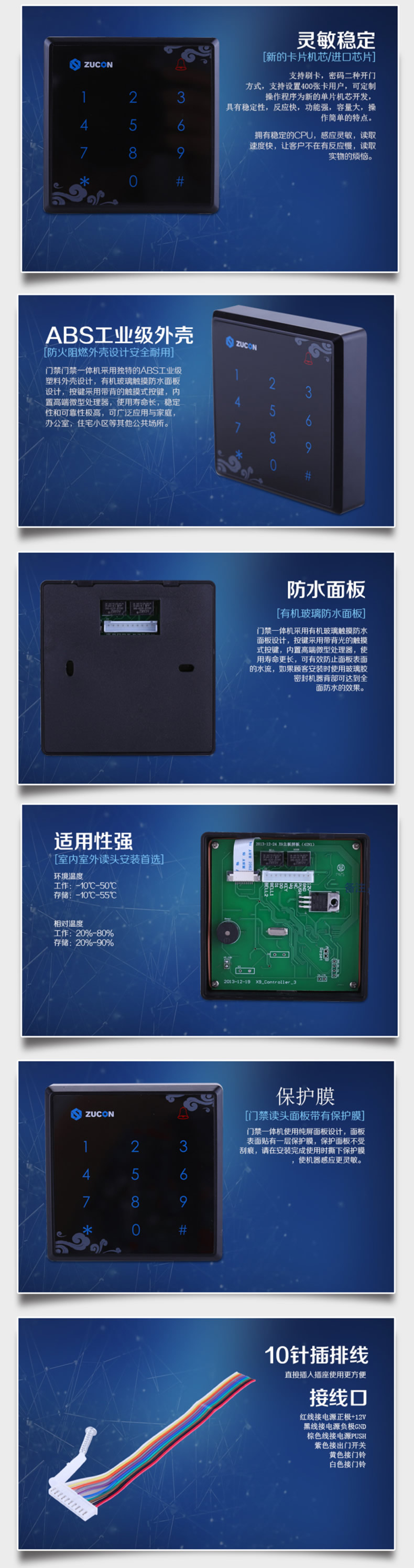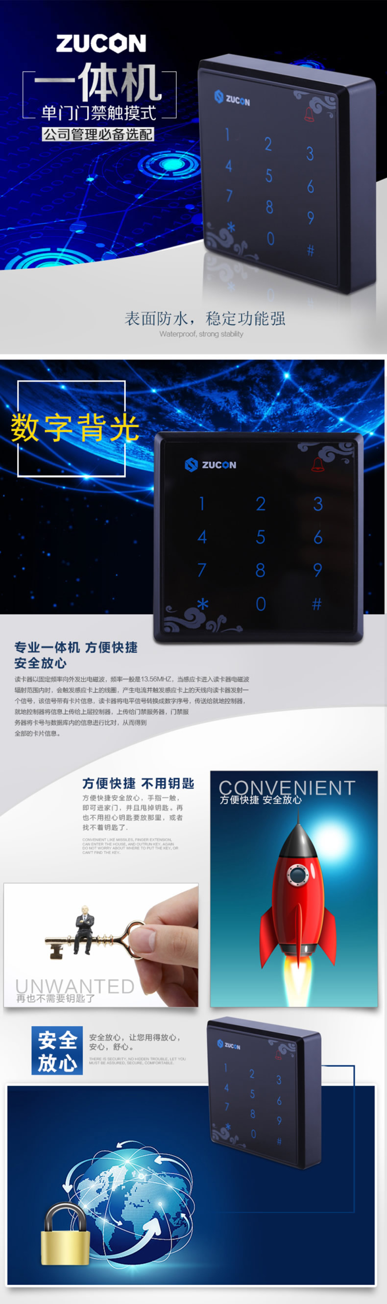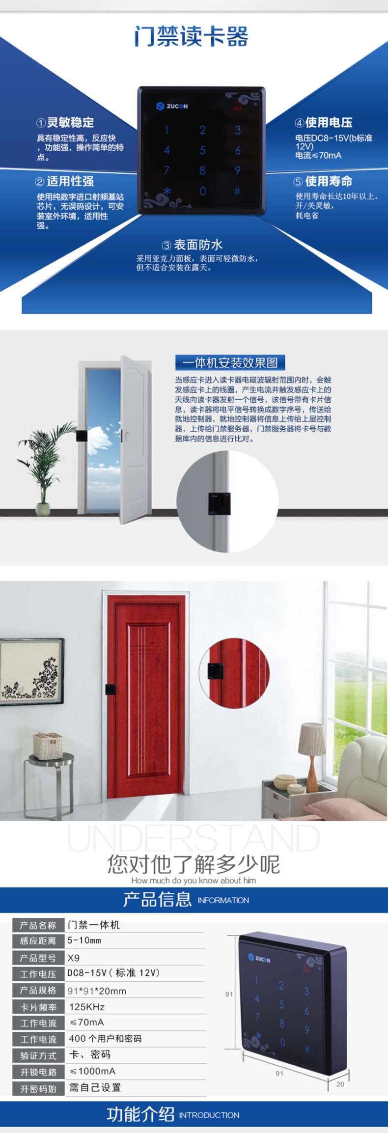 ZUCON X9豪华型门禁一体机 门禁读卡器 触摸按键读头 86型门禁读头