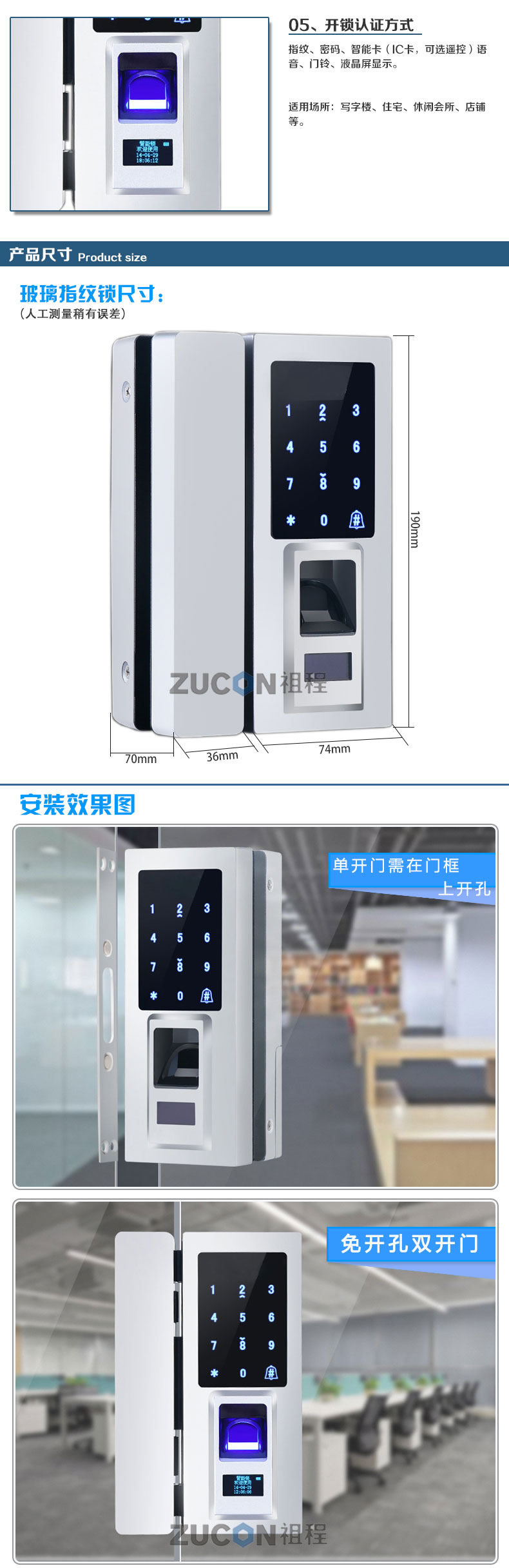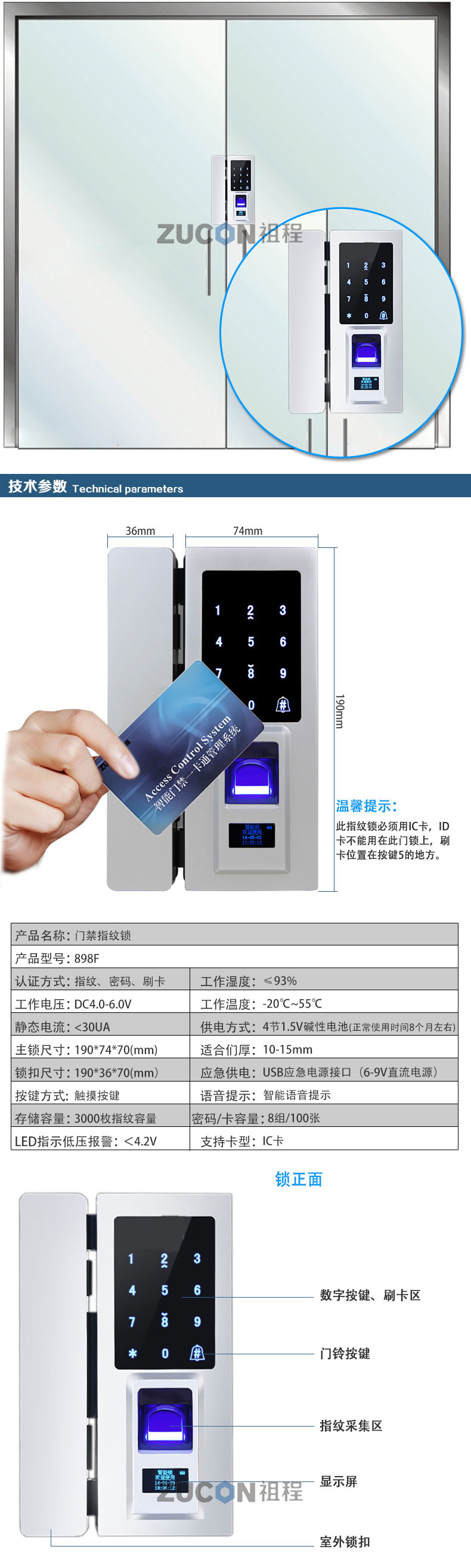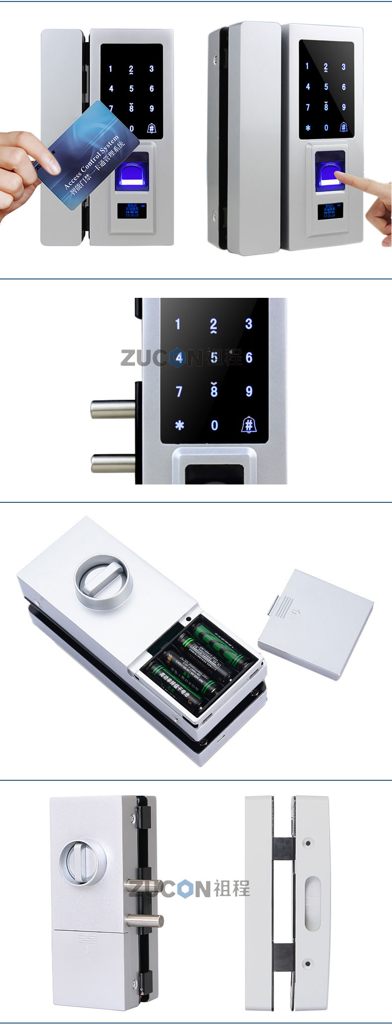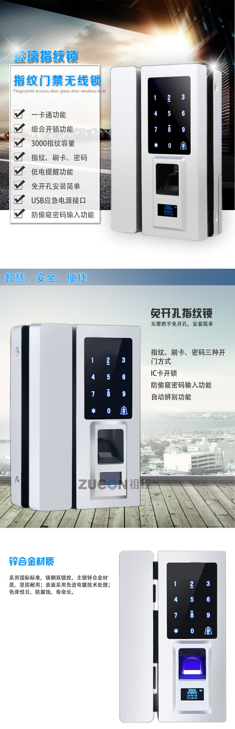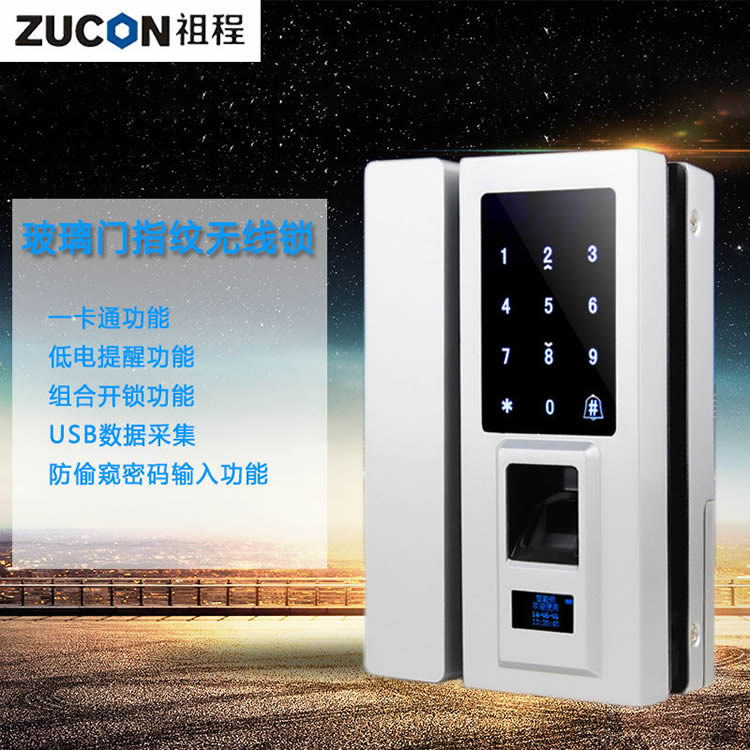 ZUCON 898F门禁锁 指纹密码刷卡 玻璃指纹锁免开孔 无线门禁一体机