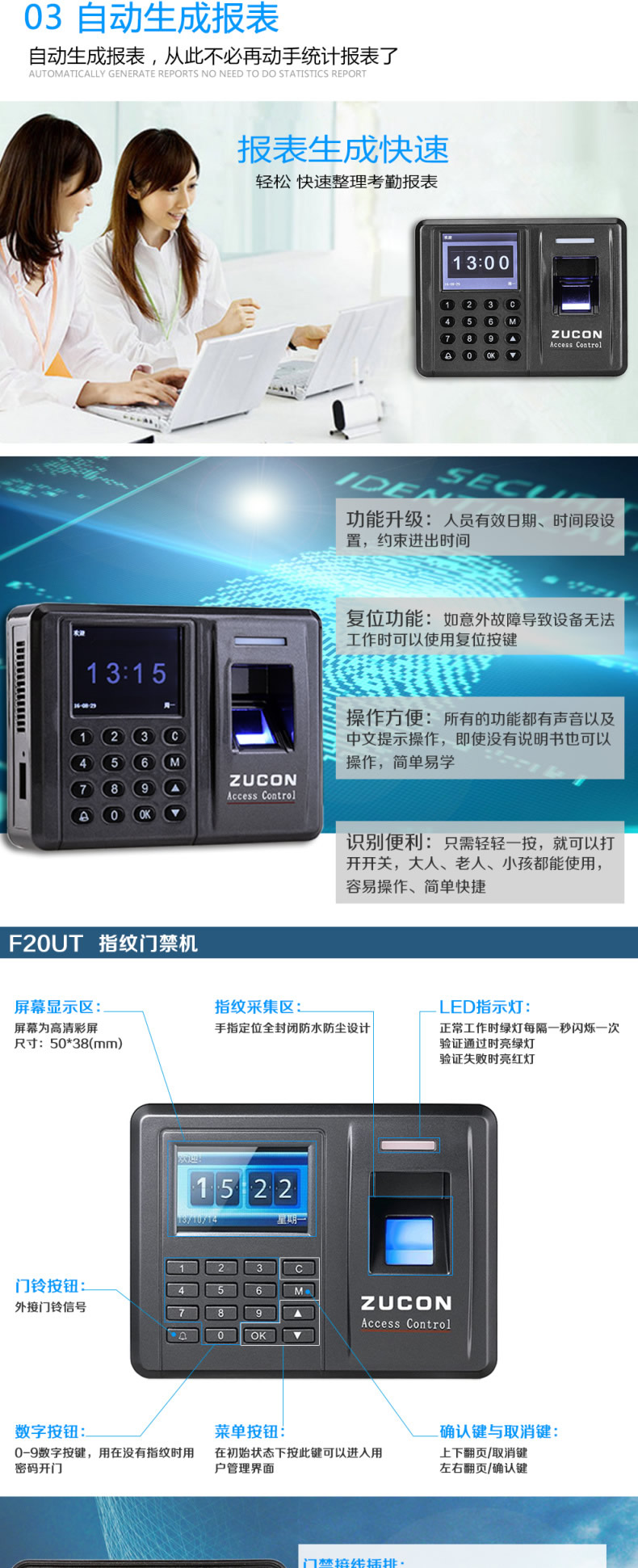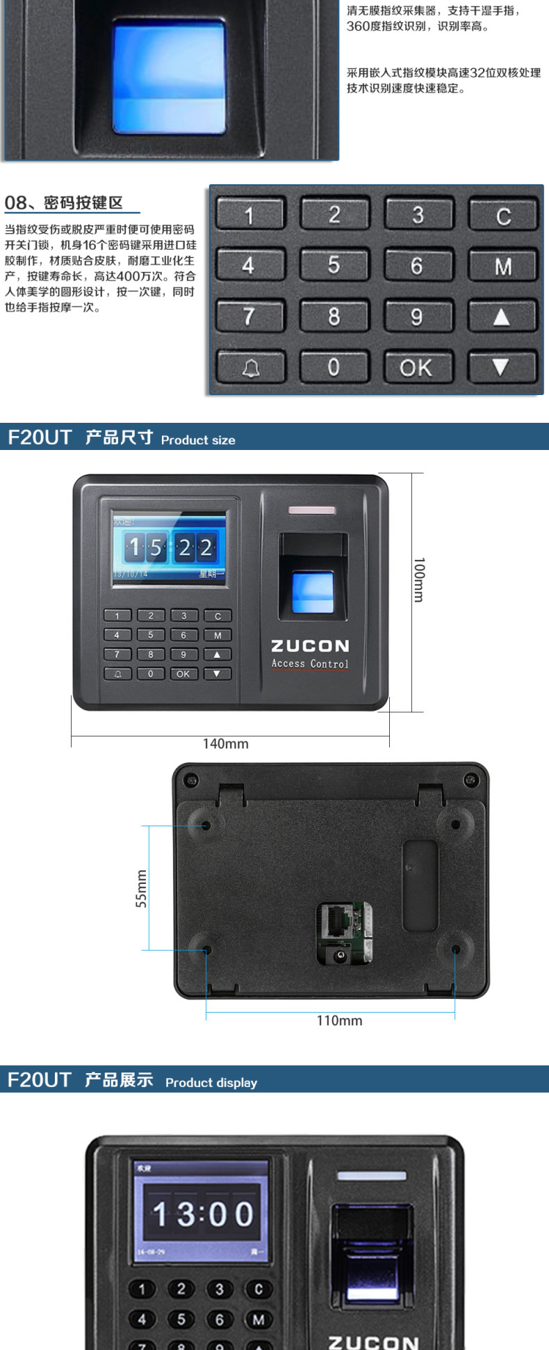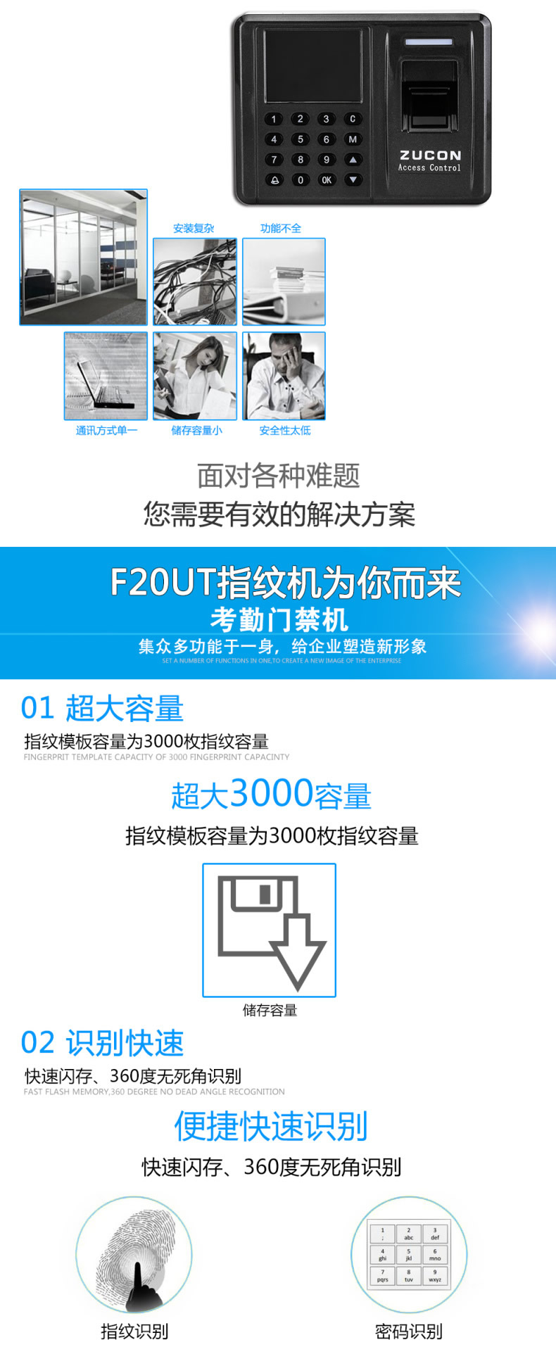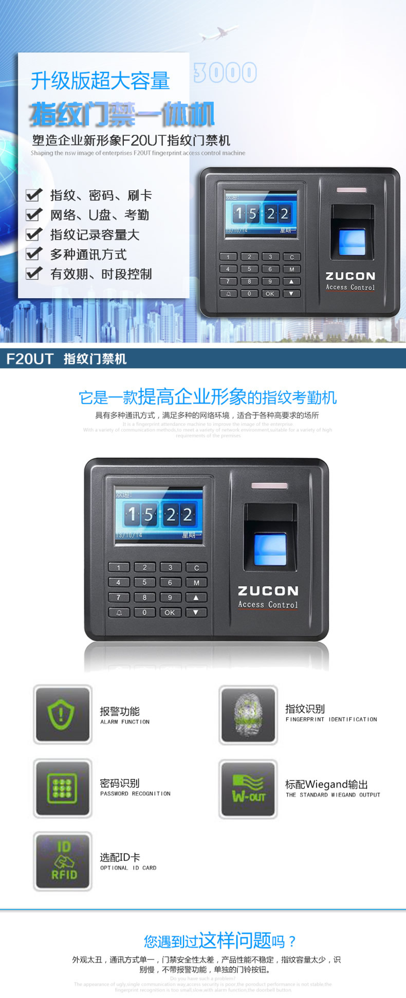 ZUCON F20UT指纹刷卡密码门禁考勤主机网络U盘下载数据3000超大容量