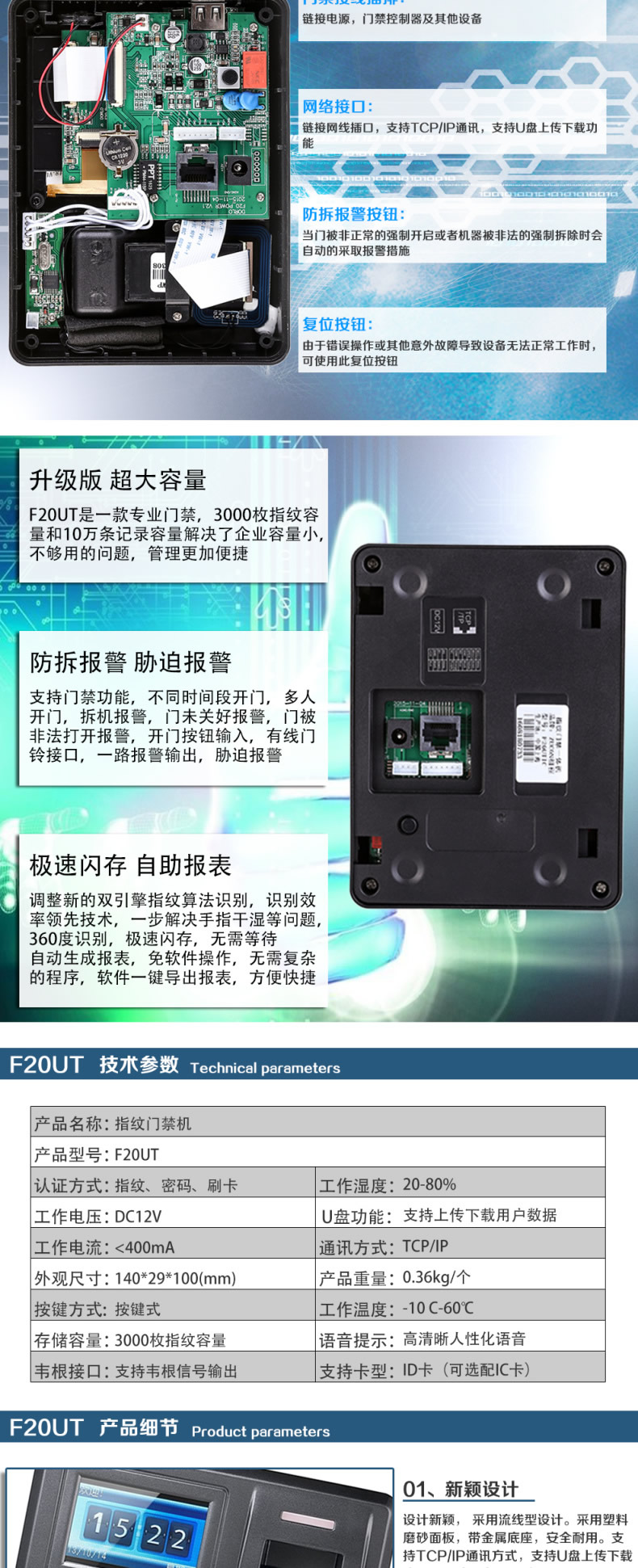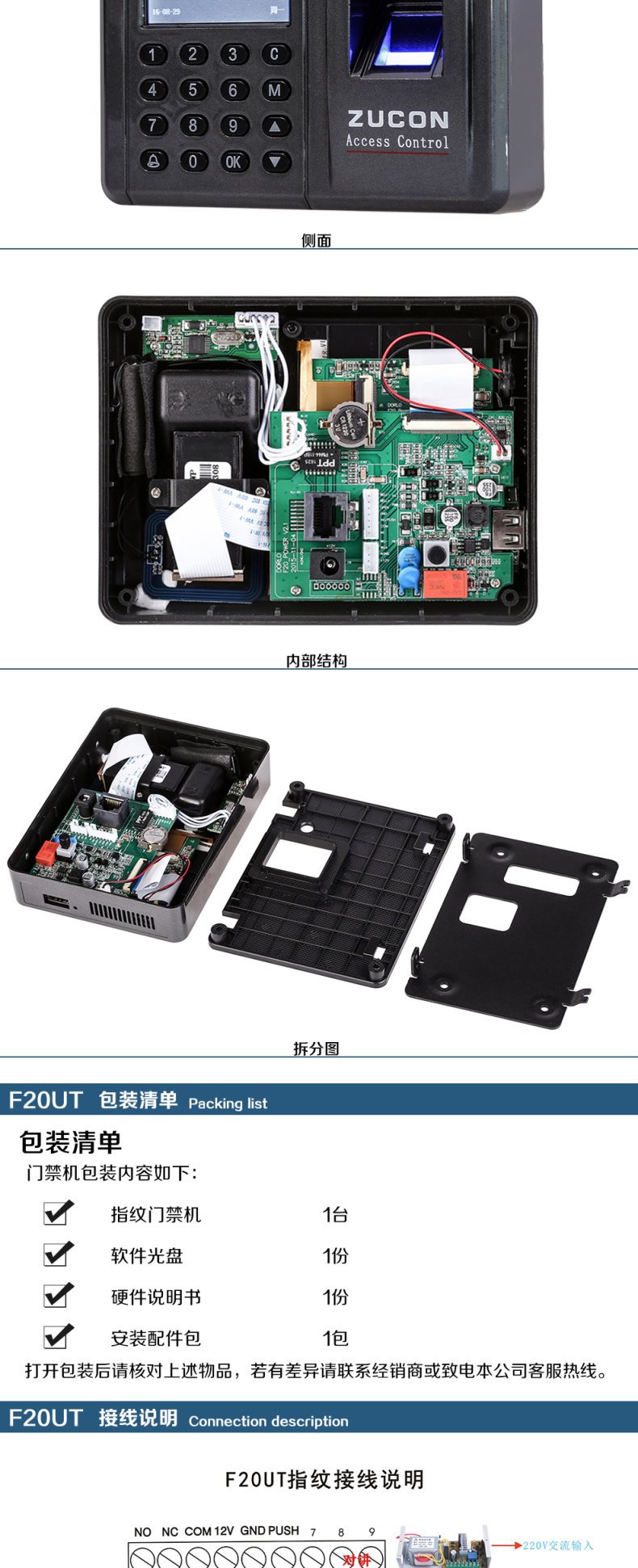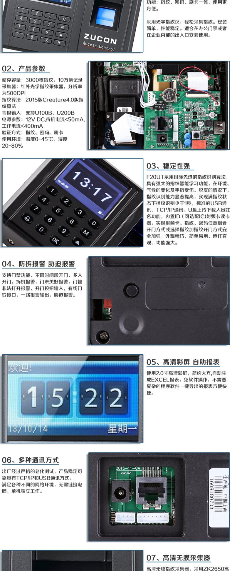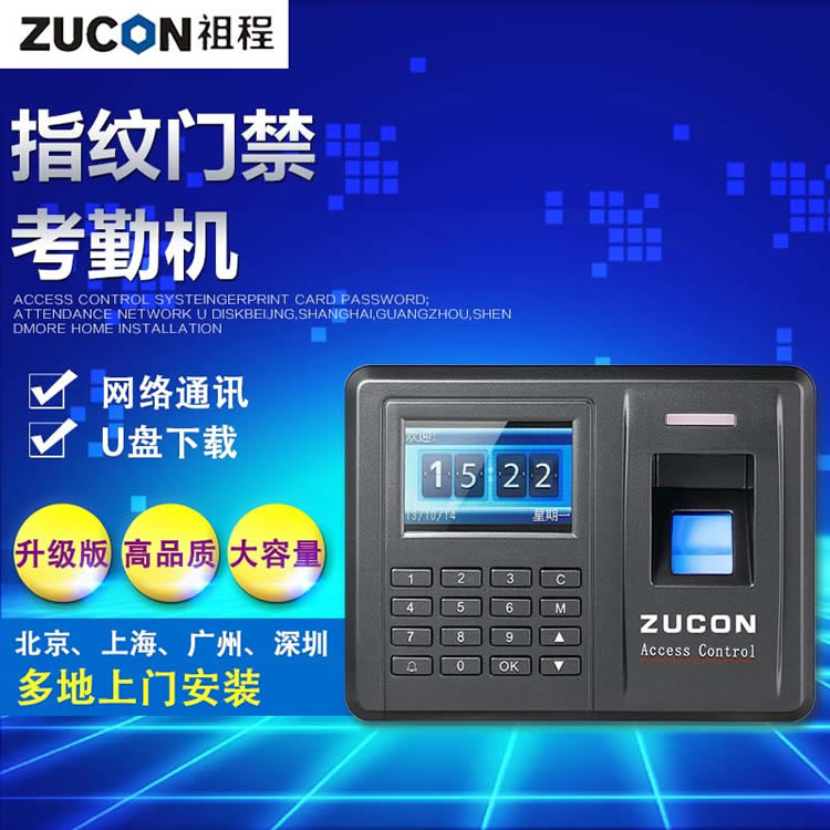 ZUCON F20UT指纹刷卡密码门禁考勤主机网络U盘下载数据3000超大容量